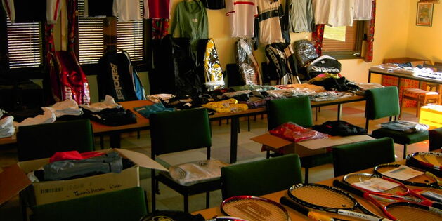 Es werden Tennisschläger, Taschen/Zubehör, Sport- und Freizeitbekleidung, Schuhe usw. zu moderaten Preisen angeboten.
