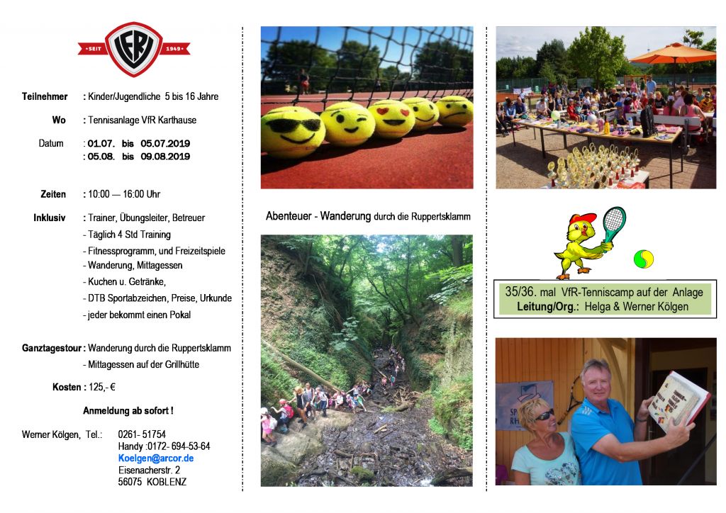 Das VfR - Tenniscamp für dieses Jahr findet in der ersten sowie letzten Woche der Sommerferien 2019 statt. Nähere Informationen können dem folgenden Flyer entnommen werden.