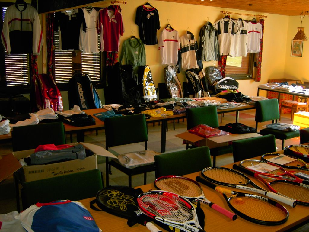 Es werden Tennisschläger, Taschen/Zubehör, Sport- und Freizeitbekleidung, Schuhe usw. zu moderaten Preisen angeboten.