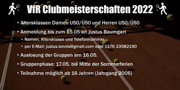 die VfR Clubmeisterschaften werden in diesem Jahr wieder stattfinden. Gespielt wird in den Altersklassen Damen U50/Ü50 und Herren U50/Ü50. Damit eine Kongruenz zu Stande kommt, müssen sich mindestens sechs Spielerinnen oder Spieler melden. Die Auslosung der Gruppen findet am 16.05. vor unserem Clubhaus statt. Nach der Gruppenphase, welche vom 17.05. bis Mitte der Sommerferien ausgetragen wird, beginnt die anschließende KO-Runde. Die Termine der Endspiele werden in den nächsten Wochen veröffentlicht. Teilnahmeberechtigt sind alle Spielerinnen und Spieler ab 16 Jahren (Jahrgang 2006).